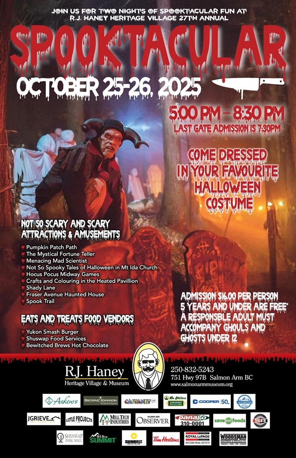 Spooktacular in Salmon Arm is held annually at the end of October at the R.J. Haney Heritage Village and Museum. It’s a beloved family event that blends tradition and fun in the spirit of Halloween. The festivities run from 5:00 p.m. to 8:30 p.m.